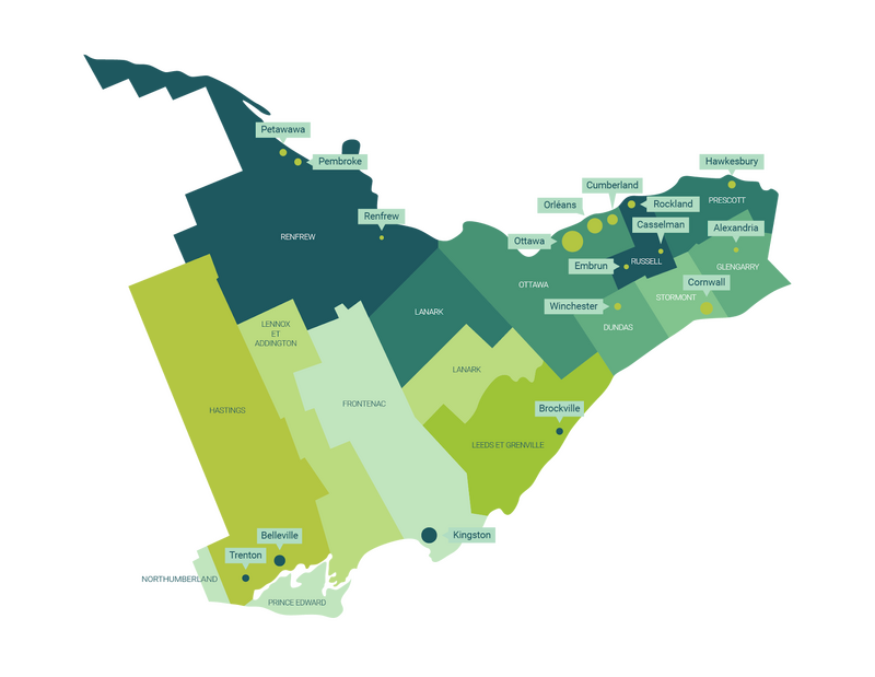 La région desservie par le RSSFE couvre l'Est de l'Ontario et le Sud-Est de l'Ontario, allant de Trenton dans le Sud, à Hawkesbury dans l'Est, jusqu'à Petawawa dans le Nord.